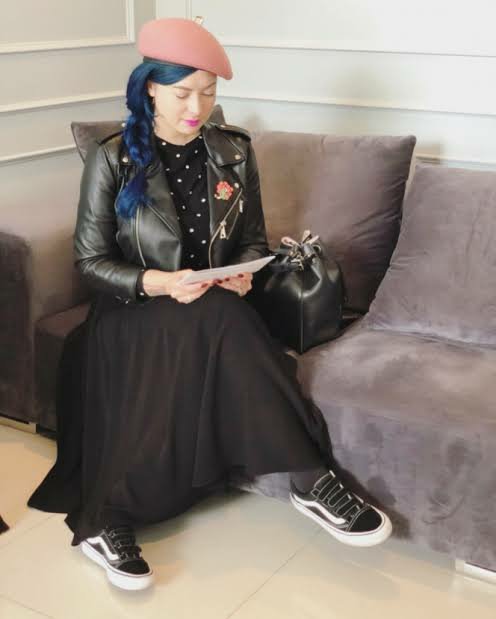 - Look pertama. Penampilan nyentrik tak lepas dari warna rambut yang unik dan jaket kulit. Hair color dark blue terlihat indah dibawah melingkar cap baret soft pink. Baju polkadot dengan rok A line, tas serut hitam dan sepatu kets menampilkan androgini style yang sempurna.