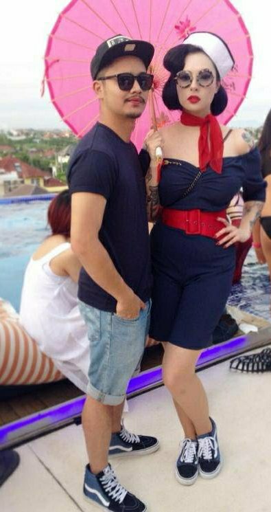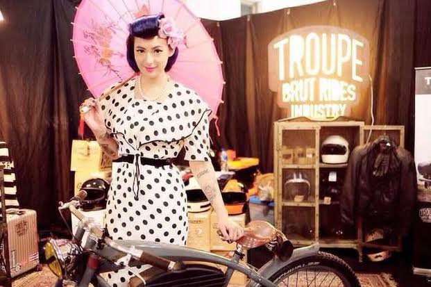 - Look ketiga. Dress polkadot bergaya bertha collar dengan aksesoris bunga yang menempel indah di rambut vintagenya yang berwarna ungu cukup membuatnya untuk terlihat nyentrik. Simple namun berkarakter.