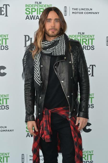 - Look kedua. Tak jauh dari penampilan Johnny, Leto memadu-padankan kaos hitam dengan jaket kulit ala rocker dibalut syal stripe. Tak lupa jins hitam dan kemeja kotak merah yang ditalikan pada pinggangnya. Style ini cocok banget buat kamu yang suka dengan perpaduan warna hitam.