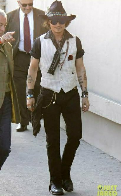 - Look kedua. Tak jauh-jauh dari look pertama, Johnny rupanya suka dengan pakaian yang bertumpuk-tumpuk. Kaos stripe dibalut denim dan rompi membuatnya terlihat seperti bajak laut yang tampan. Boots serta jins belel, tak lupa topi koboi dan sebuah kain ajaib di saku yang menjadi ciri khasnya.