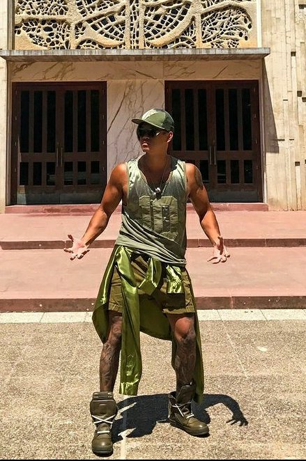 - Look ketiga. Kemeja pendek yang ditekuk di bagian lengan, rompi putih bergaris juga topi koboi andalan menampilkan kesan pria sejati. Ia juga menambahkan aksesoris gelang berduri, cincin dan jam tangan. Kurang nyentrik apalagi coba?
