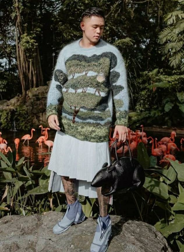 - Look pertama. Perpaduan sweater biru muda bergambar pohon rindang dengan rok lipit asimetris. Ia memakai ankle boots abu-abu dan handbag hewan berwarna hitam. Wow! Padu padan yang bertabrakan. Background alam yang melekat membuat style androgini ini memiliki keunikan tersendiri.